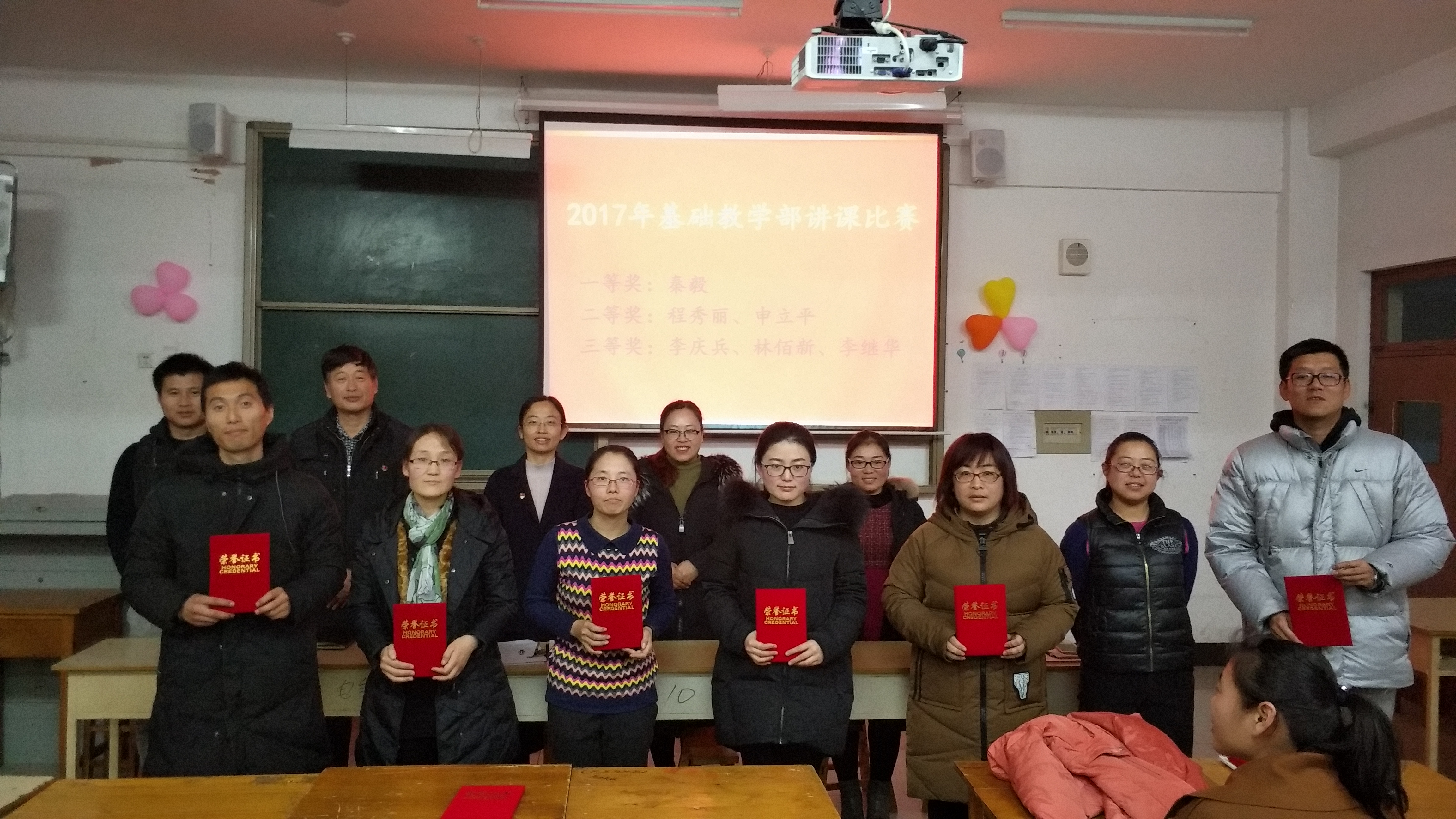 此次大会分为:课程改革经验交流、表彰先进、工作总结三个部分。课程改革经验交流主要为高职《大学英语》、高职《高等数学》、本科《大学体育》和本科《概率论与数理统计》四门课改课程的阶段性成果汇报。林静老师、程秀丽老师、于寅生老师、吴延红老师分别对所负责课改课程进行了总结,四位老师带领其教学改革团队,按照2026世界杯官网推行课改课程的要求,积极进行课程模式和教学方法的改革。表彰先进主要对在本年度2017年基础教学部优秀教案、2017年基础教学部讲课比赛、2017年基础教学部说课比赛中取得优秀成绩的个人进行表彰。基础教学部副主任李琦、基础教学部副主任刘兖峰,以及英语、数学、体育、物理教研室主任共同为获奖的18名教师颁奖并合影留念。在场老师为获奖教师鼓掌祝贺,纷纷表示要向先进教师学习,鼓足干劲,奋起直追,不断提升教育教学能力。