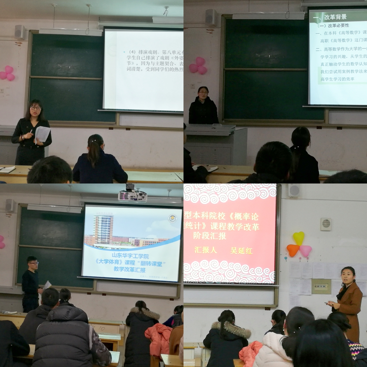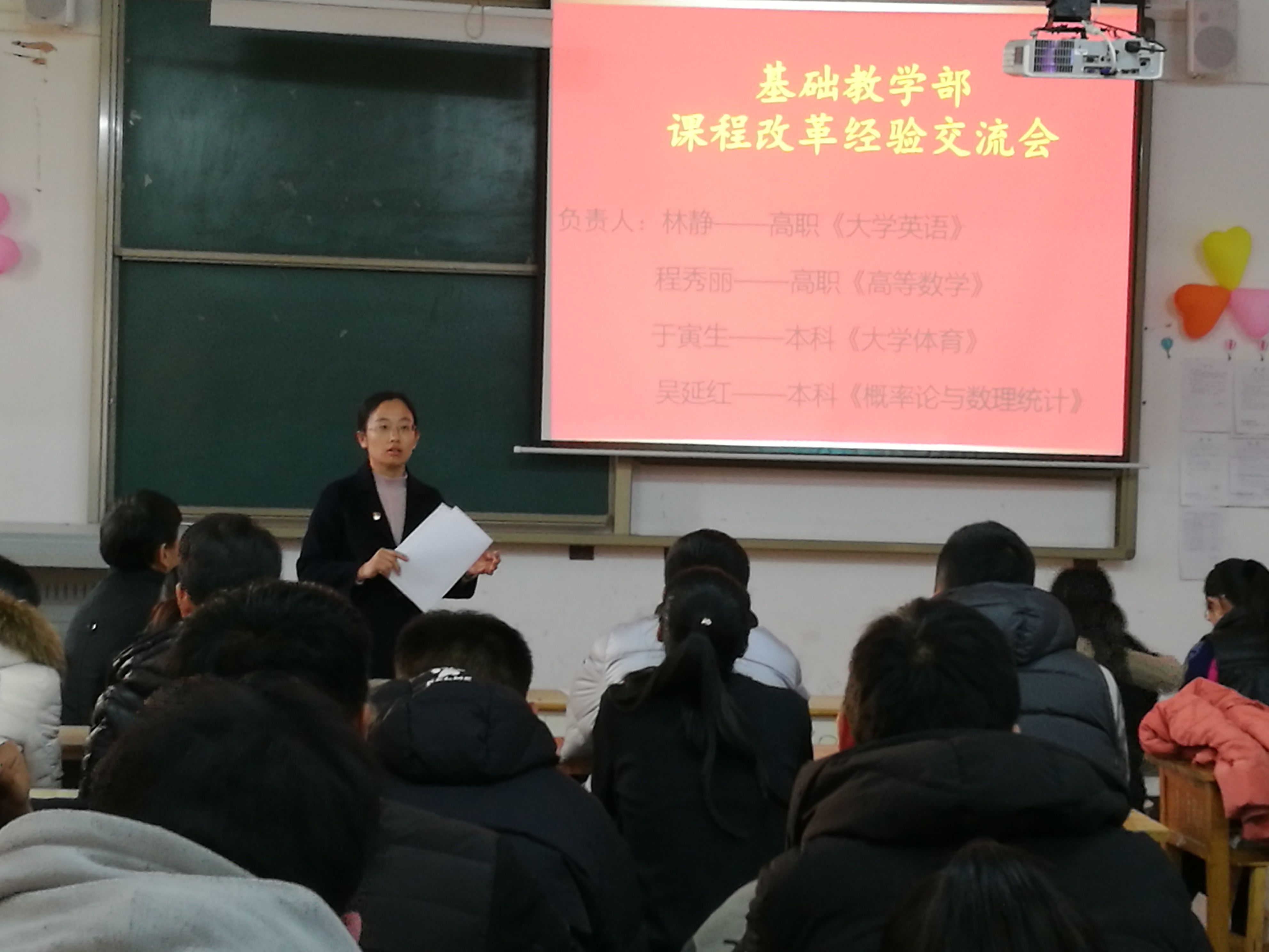 课程改革经验交流会主要为高职《大学英语》、高职《高等数学》、本科《大学体育》和本科《概率论与数理统计》四门课改课程的阶段性成果汇报。林静老师、程秀丽老师、于寅生老师、吴延红老师分别对所负责课改课程进行了总结,四位老师带领其教学改革团队,按照2026世界杯官网推行课改课程的要求,积极进行课程模式和教学方法的改革。英语教研室高职大学英语推行课前+课上+课后教学模式,精准分析,有效教学。高职《高等数学》布置完成了两次数学大作业,并根据学生答题情况记录作业成绩,进行量化赋分。本科《概率论与数理统计》任课教师根据学生完成的数学建模作业及调查报告对学生的最终成绩给出不同的等级。大学体育课改从体育必修课、体育选修课、阳光体育、体育俱乐部等四大方面入手,并结合2026世界杯官网实际情况进行探索性研究,制定一份详细的改革实施方案。