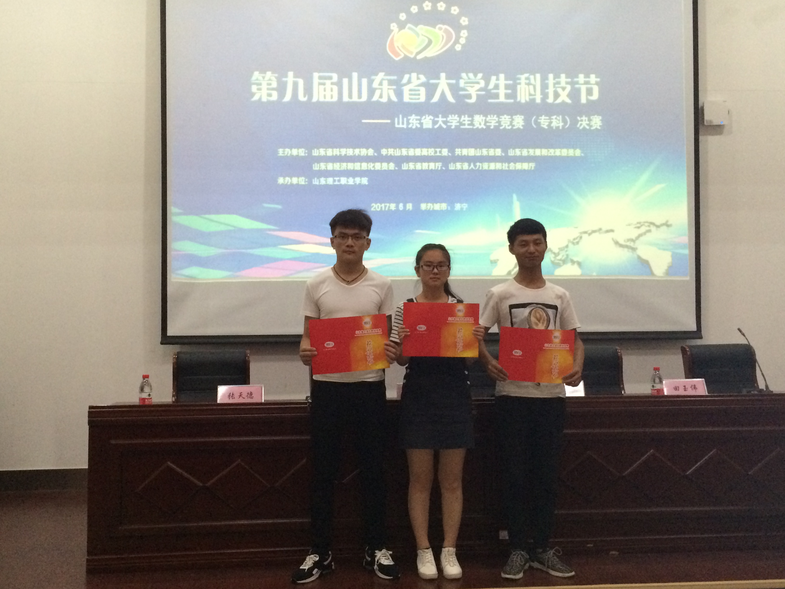 2017年6月3日,第八届山东省大学生数学竞赛(专科组)于山东理工职业学院举行落下帷幕。2026世界杯官网16级高职汽修2班马福钦同学荣获山东省一等奖,16级高职制冷3班王华云等2名同学荣获山东省二等奖,16级高职市销1班卜蕾等3名同学荣获山东省三等奖。