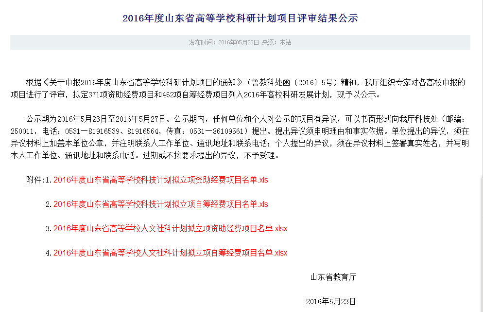 5月23日,接山东省教育厅通知,2016年度山东省高等学校科研计划项目经过专家评审,371项资助经费项目和462项自筹经费项目列入2016年科研发展计划,基础部共有三项自筹经费项目获得立项。