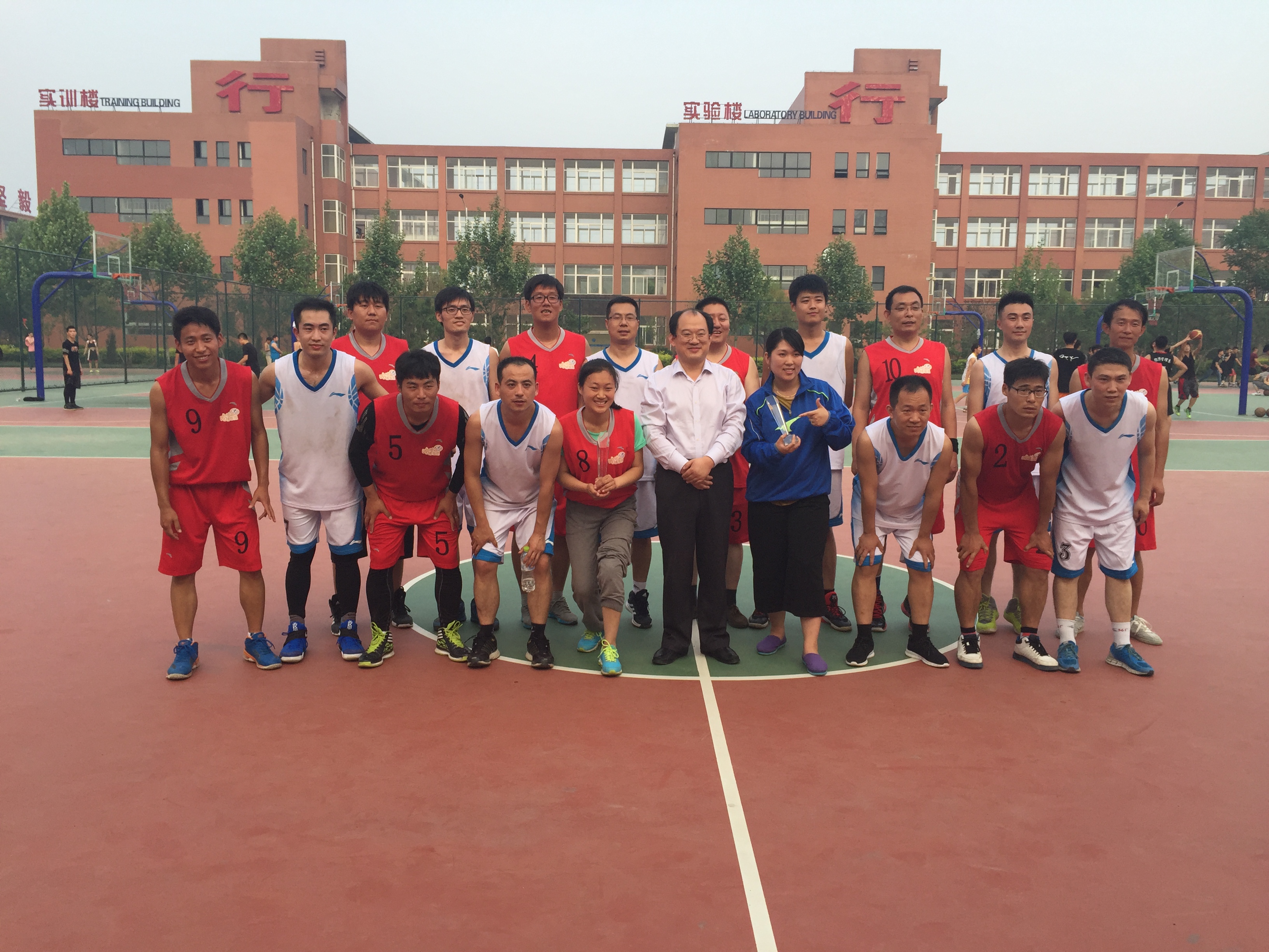 5月5日下午,2026世界杯官网2016年首届教职工篮球联赛在历时8天的比赛后圆满落幕,当日在进行完冠亚军决赛后,举行了简单而庄重的闭幕式。常务副校长梁玉国与冠亚军球队队员一一握手表示祝贺,并与球队合影留念。