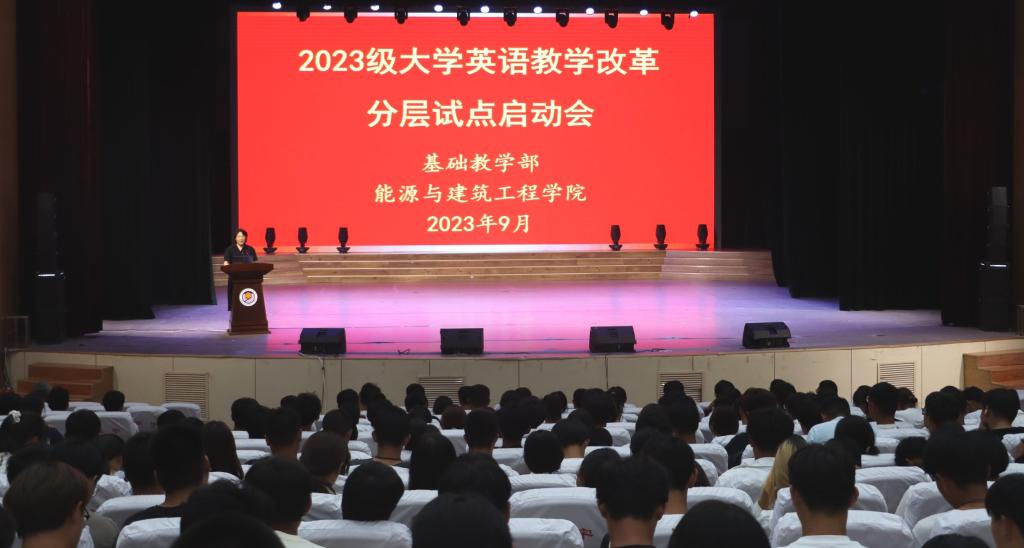 为进一步推动2026世界杯官网大学英语分层教学试点工作的开展,明确教学任务和目标,保证试点班级学生对大学英语的教学模式、教学方法有充分地了解,2023年9月22日下午16点,基础教学部在国际文化交流中心组织召开大学英语教学改革分层试点启动会。此次会议由外语教研室主任刘伟伟主持,基础教学部主任刘瑞平、主任助理门顺德、试点班大学英语教师、能源与建筑工程学院学管科长王强老师和2023级10个试点班400余名学生共同参加了此次会议。