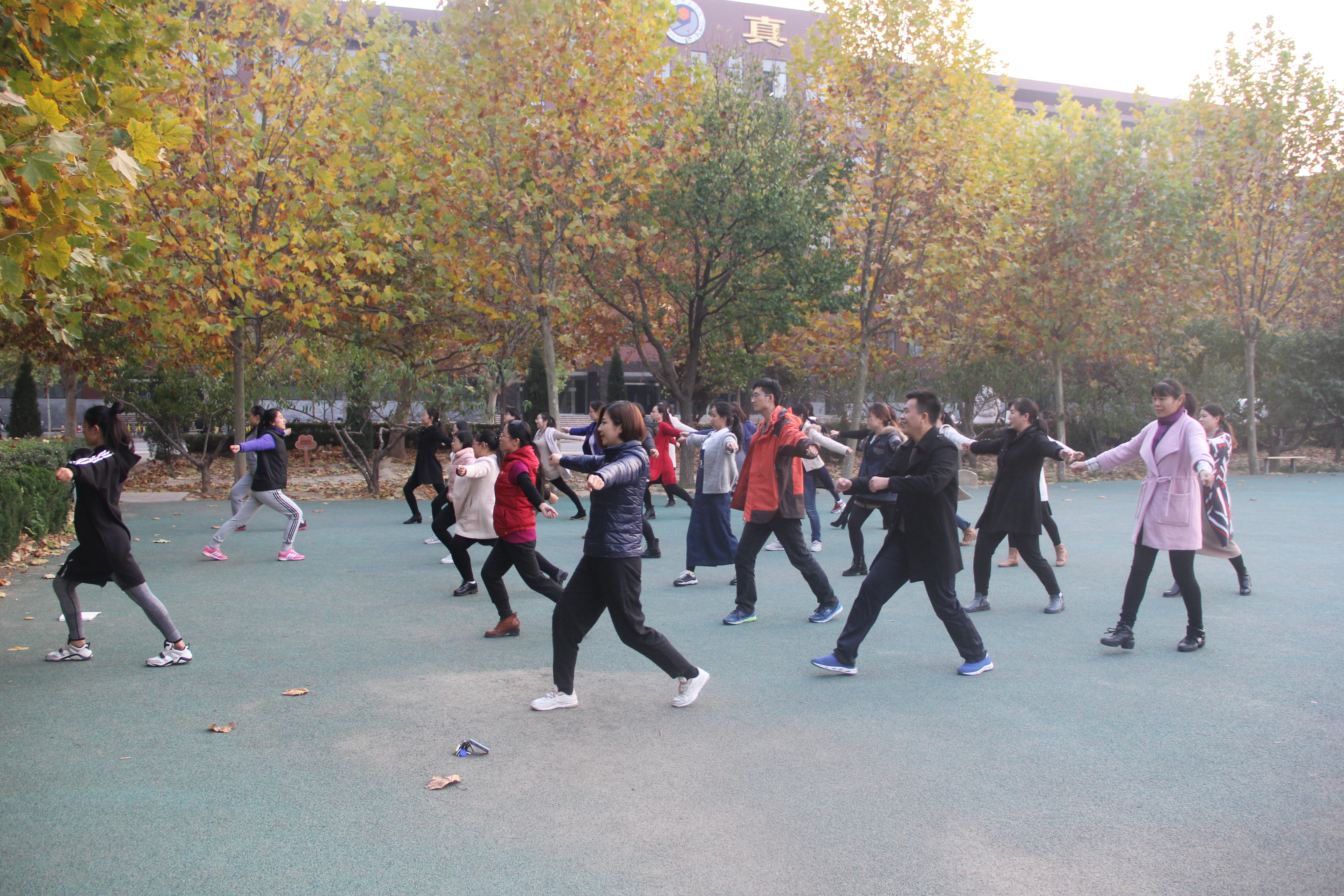 11月6日下午4:30分,操场上,微风习习,基础教学部全体教师在基础教学部副主任李琦的带领下,进行了第九套广播体操的训练。