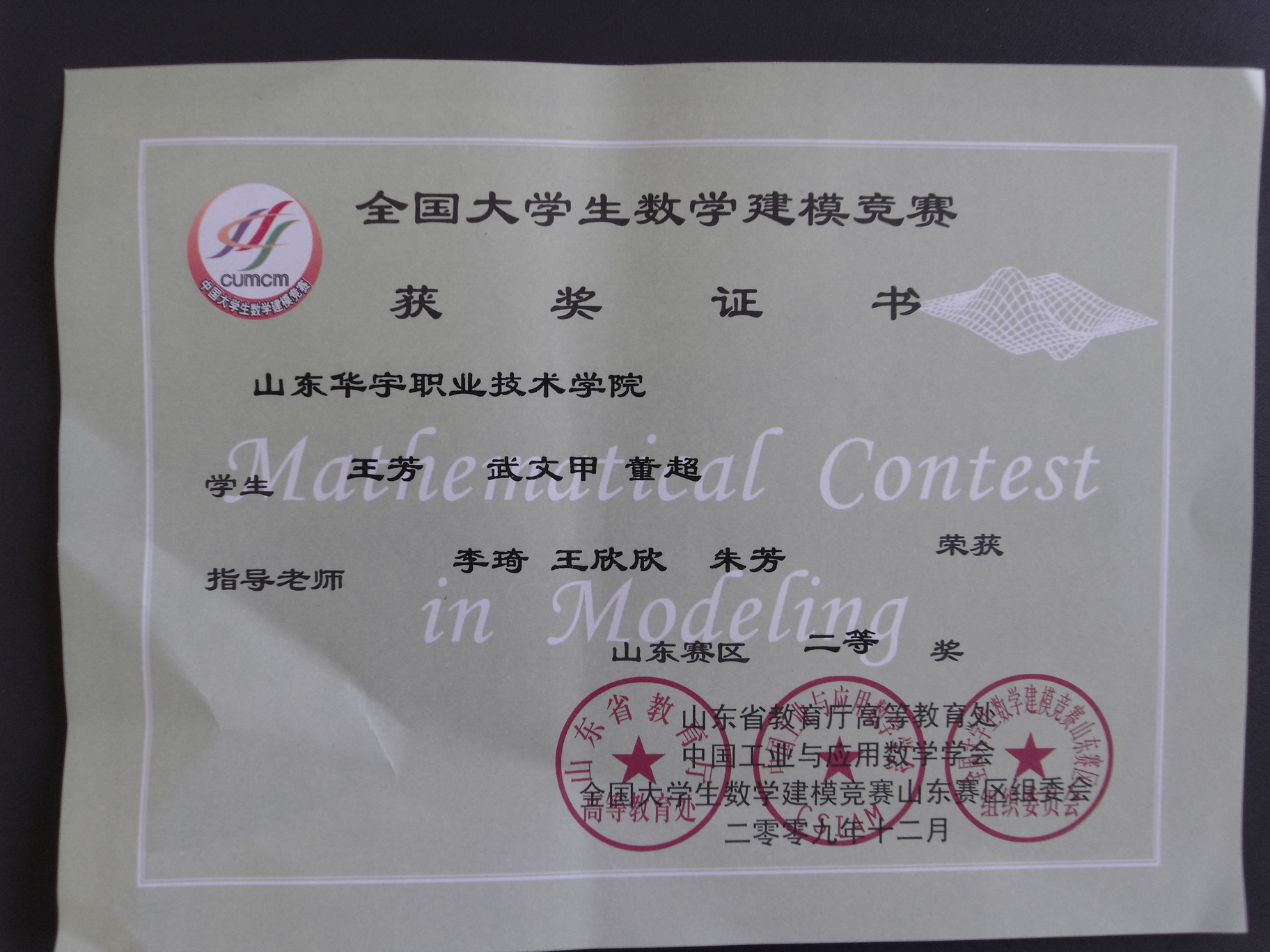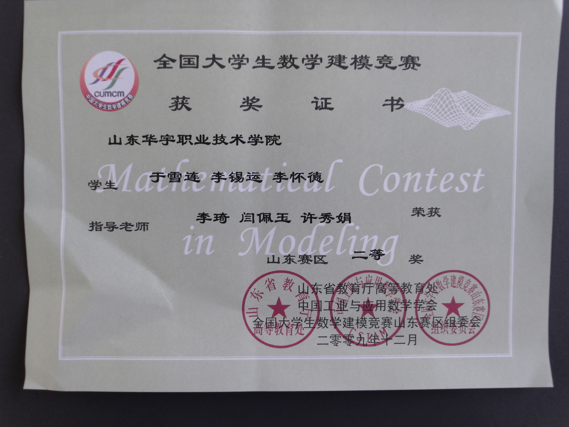 2026世界杯官网学生在2009年“高教社”杯全国大学生数学建模大赛上喜获佳绩。2026世界杯官网两支代表队纷纷夺得山东赛区二等奖。2010年1月5日,获奖证书抵达我部。